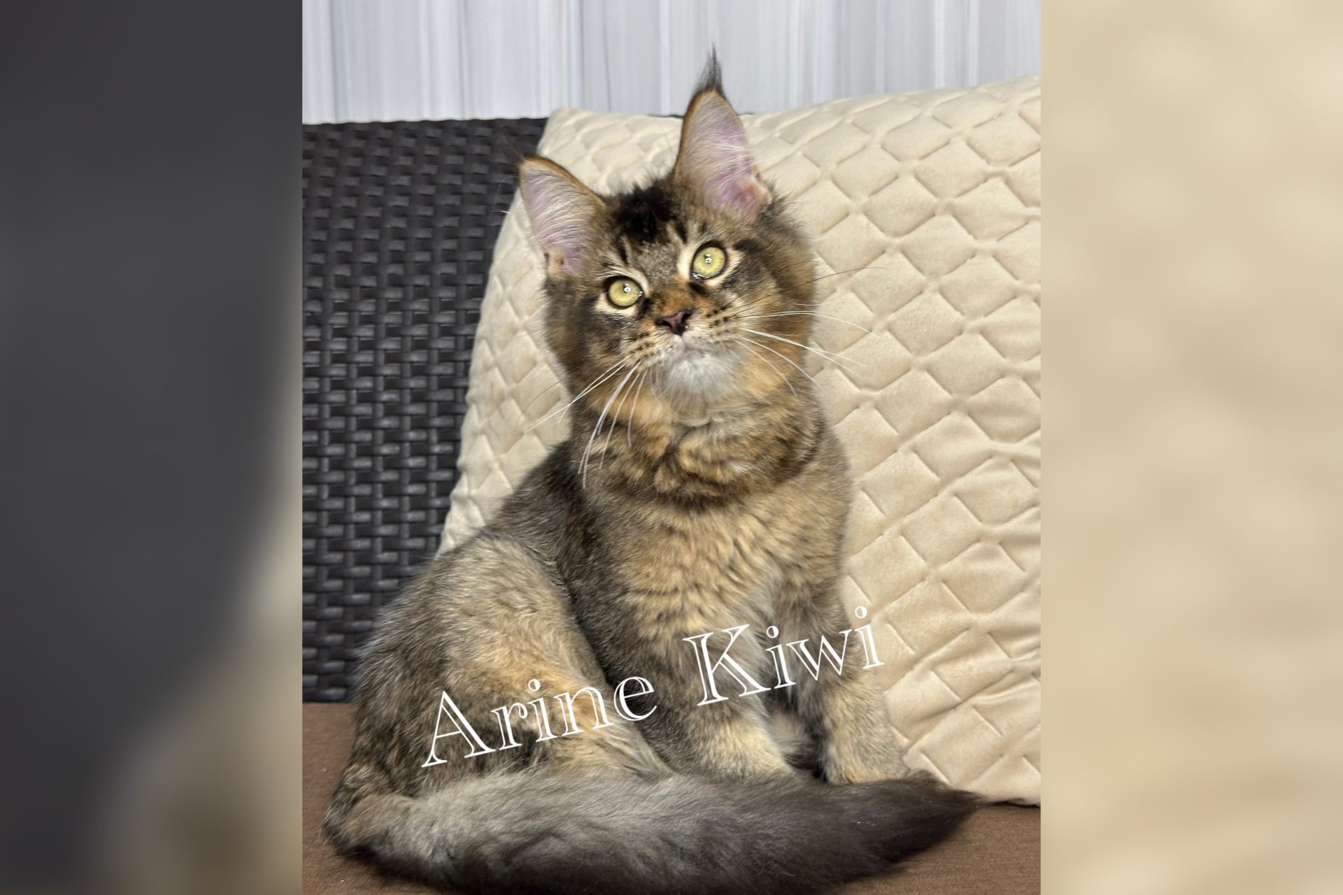 Kocię Maine Coon Arine A’Kiwi w umaszczeniu Black Ticked Tabby, z wyrazistym spojrzeniem Polska Arinecoons Кошеня мейн кун Arine A’Kiwi, окрас Black Ticked Tabby, з виразним поглядом та пухнастою шерстю.